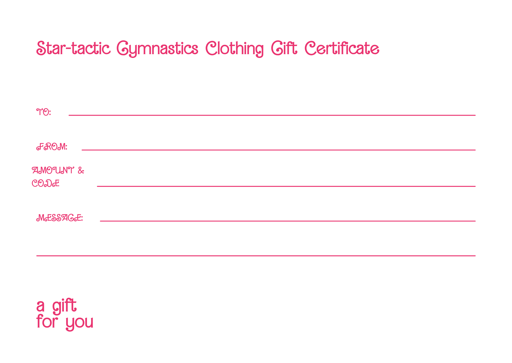 Star-Tastic Gymnastics Clothing Gift Cards are the perfect present for gymnasts. Give the gift of choice with a card that can be redeemed towards our full range of high-performance athletic and training gear, and accessories. Whatever they're looking for , recipients can select exactly what they need. Available in flexible denominations, these gift cards make an ideal present for birthdays, competitions, or simply rewarding dedication to the sport. No expiration date means they can shop whenever they're ready. The code and gift card will be emailed out to you.